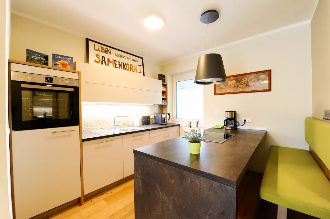 Entdecken Sie den einladenden Kochbereich mit einer stilvollen Kochinsel, die nicht nur eine moderne Ausstattung bietet, sondern auch eine gemütliche Sitzgelegenheit direkt beim kulinarischen Geschehen. Genießen Sie entspannte Stunden beim Zubereiten köstlicher Mahlzeiten!